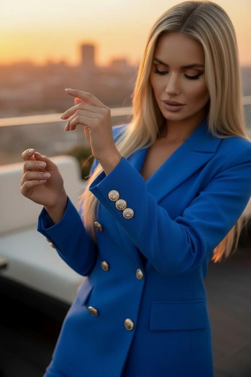 Conjunto dos piezas. Blazer con cuello solapa de muescas y manga larga con hombreras. Bolsillos en parte delantera. Cierre frontal con botones y botones dorados en mangas. Pantalón recto ajustado.