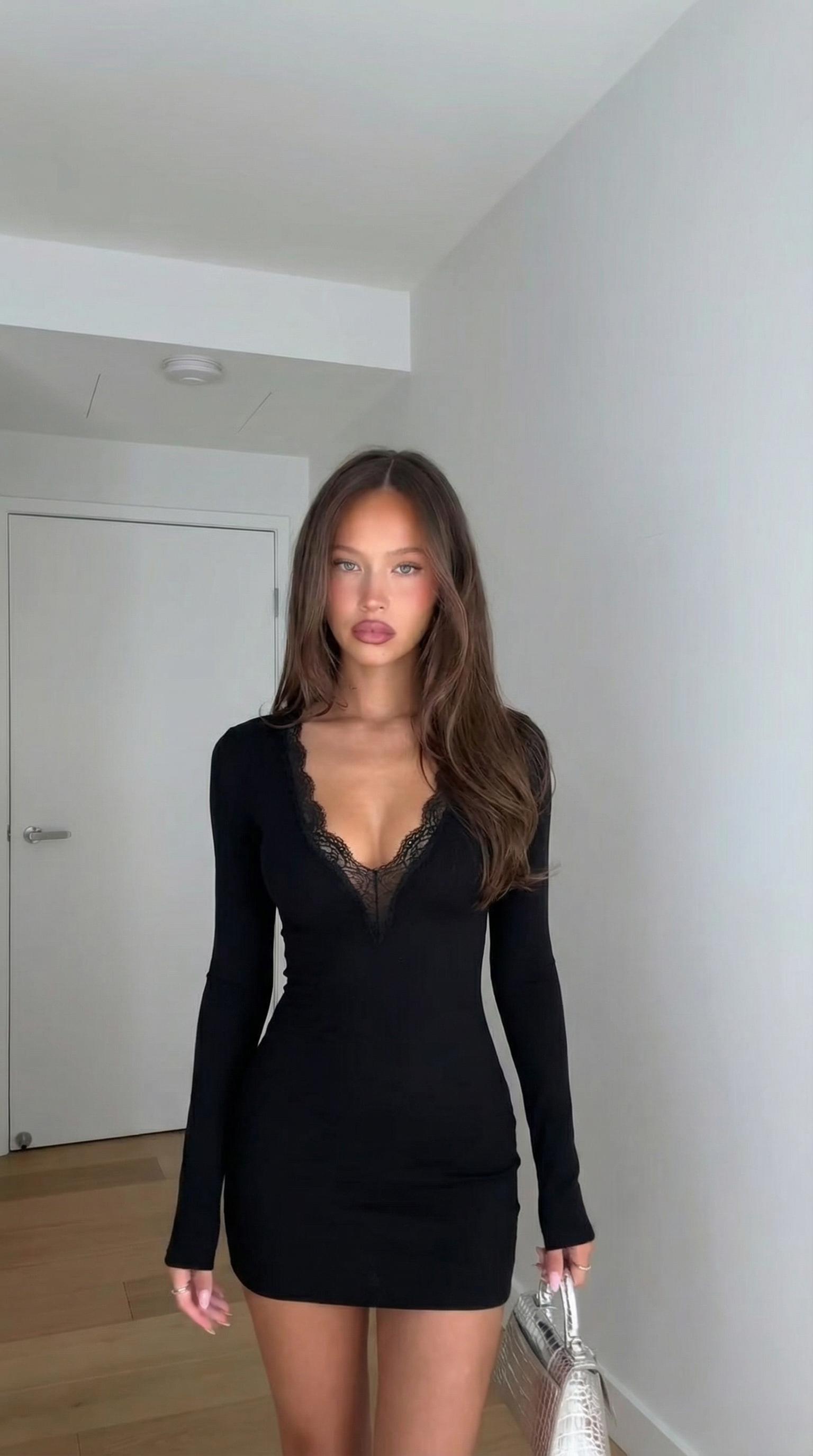 Vestido corto de escote en pico con detalles de encaje combinado a tono. Mangas largas ajustadas. Detalle de frunces en delantero.