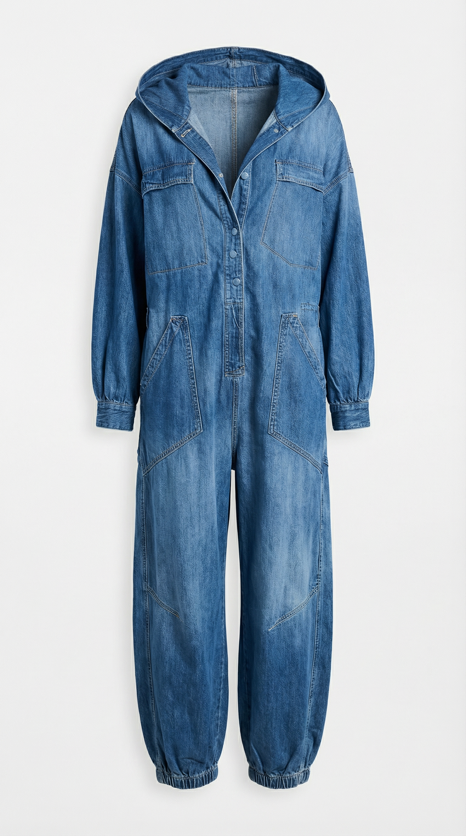 Mono de cuello solapa y manga larga. Bolsillos delanteros y bolsillos de plastrón en espalda. Pierna recta. Cierre frontal con cremallera y botones metálicos.
